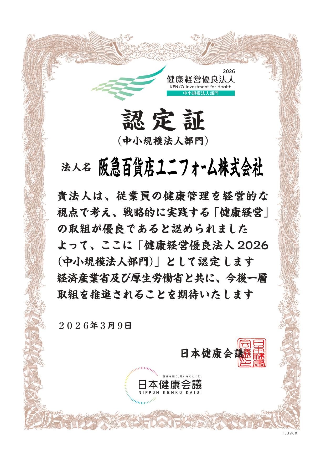 阪急百貨店ユニフォーム株式会社では、「人の尊重」を大切な価値観としており、従業員やその家族の健康が会社の豊かな未来の礎であると考え、2023年8月1日に「健康経営宣言」を制定いたしました。その「健康経営宣言」に基づき、従業員やその家族の健康に対する意識向上を促し、働きやすい職場の実現を推進するためのさまざまな取り組みを行い、昨年度に続き「健康経営優良法人」に認定されました。